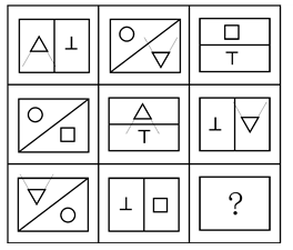 答案:D。 解析:每行图形中,分割矩形的线条分别为竖直、水平与对角线,内部含有的元素均为正三角、倒三角、正T、倒T、圆与正方形。第三行图形缺少水平分割线以及正三角与正T,故选D。">