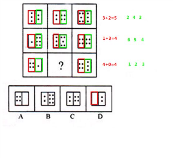 这道题属于数量类,主要考察图形的每种元素各有几个的变化规律。1,2列里前一格的黑点相加等于3列里前一格的黑点,后一格中的黑点每一行均成等差数列(2、3、4)、(4、5、6)、(1、2、3)。