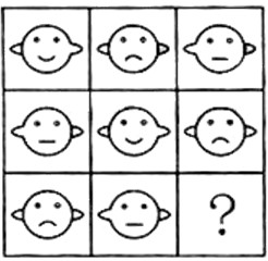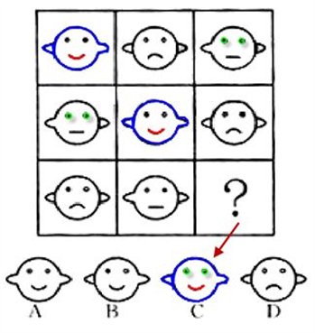 这道题属于数量类,主要考察图形一共有几种元素。前两组图形的第一个规律为其嘴分别为向上弯、向下弯和平嘴,可排除D;第二个规律为左边相通、右边相通和左右都不通,可排除A;第三个规律是眼睛分别是左黑右白,左白右黑和左右皆白,可排除B,所以选C项。">
