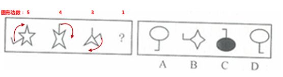 这道题属于数量类,主要考察图形的内角数量。图形角的数量不断减少,且整体呈顺时针旋转,故正确答案为A。">