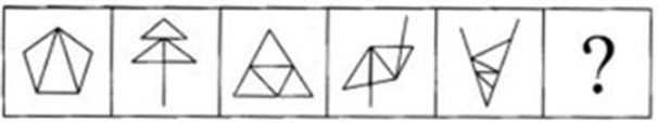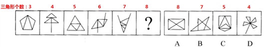 这道题属于数量类,主要考察图形的每种元素有几个。给定项分别对应3、4、5、6、7的三角形,所以未知项应该是8个三角形,即A选项。