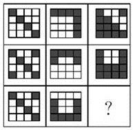 答案:B。 解析:横看,第一行黑色方格数分别为4、7、11,第二列为6、6、12,第三列为5、8、?,可以看出规律为每行的前两幅图黑色方格数相加等于第三行的黑色方格数。因此?含13个黑色方格,选B。">