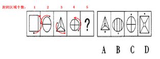 这道题属于数量类,主要考察图形的封闭区域个数的等差递变规律。观察可知,每个题干图形都由一个大图形和一个小黑点组成,其中大图形里的封闭空间数分别 是 1,2,3,4,由此推断 图形里的封闭空间应该有 5 个,排除 A,C 两项;同时,小黑点依次逆 时针旋转 135°,由此排除 B 项. 所以,正确选项是 D