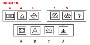 这道题属于数量类,主要考察图形的封闭区域个数。左边图形分隔成4部分 右边则分成5部分(此解析由七月提供)">