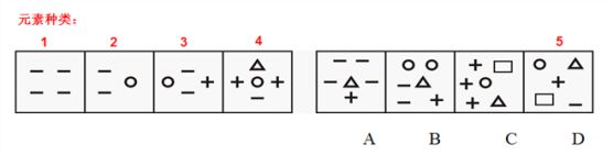这道题属于数量类,主要考察一共有几种元素。主要看图形种类个数的变化,分别递增,所以接下来应该是五种图形,所以选择D