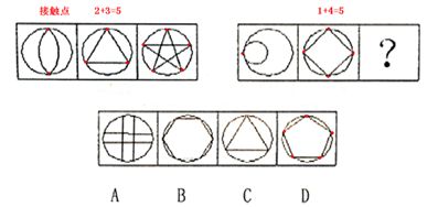 这道题属于数量类,主要考察图形的交点类型:接触点。考虑内部图形与外部图形的接触点的个数 第一组图依次是2,3,5;第二组依次是1,4,(5) 其中2+3=5,1+4=(5)