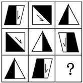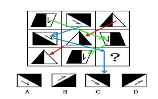 这道题属于数量类,主要考察图中每种元素各有几个。每行每列中都有平行四边形、正方形和等边三角形各一个。第一行和第三行的箭头位置是一样的。