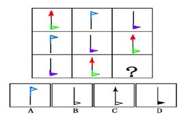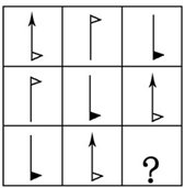 这道题属于数量类,主要考察图形中的每种元素各有几个。每行每列各有两个空心三角形、一个实心三角形和一个箭头,并且实心三角形在线段下方,箭头在线段上方,空心三角形线段上下各有一个。