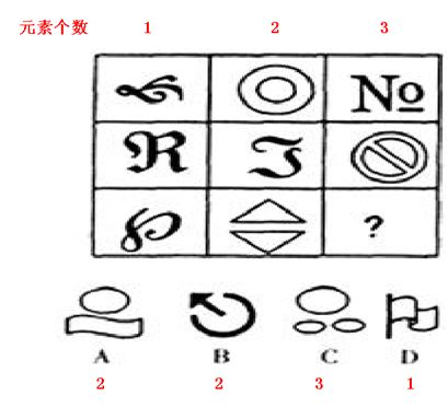 这道题属于数量类,主要考察每组图中的每个图形一共有几种元素。第1列各图形都由一部分构成,第2列各图形都由两部分构成,第3列各图形都由3部分构成。
