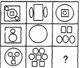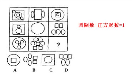 这道题属于数量类,主要考察图形的几种元素间的数量对比。题干各图形中,圆种数量都比方形多一个,故选择B。