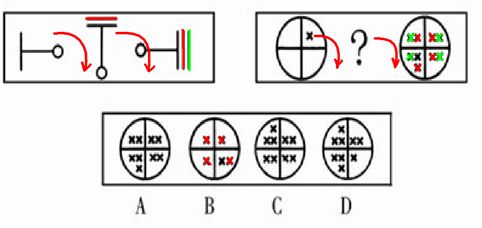 答案:B。 解析:这道题属于数量类,主要考察图形中的每种元素有几个的等差递变规律。第一组图中,与带圈线垂直的线条数量分别为1,2,3,是公差为1的等差数列,方向呈顺时针旋转,每次旋转90度。所以第二组也当符合这一规律:乘号的数量呈等差数列,且呈顺时针旋转,所以答案为B项。