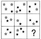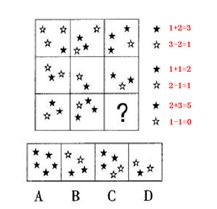这道题属于数量类,主要考察图形中的几种元素间的数量对比。观察可知,每行前两个图形中的黑色五星数量之和等于第三个图形中的黑色五星数量,前两个图形中的白色五星数量之差等于第三个图形中的白色五星数量.按照这个规律,只有A符合要求.所以,正确选项是A.