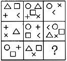 答案:B。 解析:题干图形中,每行中有六个不同符号,且每个符号在每行中各出现两次,依此规律,未知项不能有正方形。故选B。">