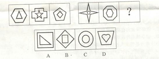 A.如上图A所示 B.如上图B所示 C.如上图C所示 D.如上图D所示 答案:A。 解析:本题考查数量类中线段的问题。题干中左段的3个图形的内、外图形的线段数(3,6),(10,12),(4,5),外边图形的线段数与内部图形的线段数相减为3,2,1。右段所给两个图形的内、外图形的线段数(5,8),(6,8),外边图形的线段数与内部图形的线段数相减为3,2。应该选择一个外边图形的线段数与内部图形的线段数相差为1的图形。选项中只有A选项符合(3,4)。因此,本题答案为A选项。">
