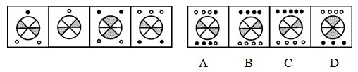 A.A B.B C.C D.D 答案:C。 解析:题干阴影部分逆时针转动,小圆圈的总数按3+1=4,1+4=5,4+5=9的规律变化,且上方和下方小黑圈、小白圈依次出现。因此,本题答案为C选项。">