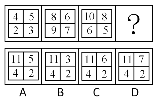 A.如图所示A B.如图所示B C.如图所示C D.如图所示D 答案:A。 解析:前三组图形的规律分别是:3×4-2×5=2;8×7-6×9=2;10×5-8×6=2;A选项:11×2-5×4=2,所以A选项正确。B错在4×6-11×2=2相乘位置与题干不一样。">