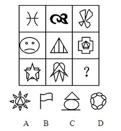 A.A B.B C.C D.D 答案:D。 解析:本题考查封闭面的个数。九宫格分行看,第一行中图形封闭面的个数分别为0、1、2;第二行图形中封闭面的个数为3、4、5;第三行图形中封闭面的个数分别为6、7、(8),只有D选项中封闭面个数为8个,因此本题选D选项。">