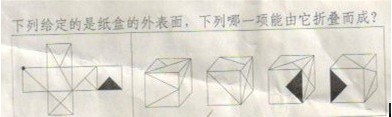 A.如上图A所示 B.如上图B所示 C.如上图C所示 D.如上图D所示 答案:A。 解析:本题考查图形的空间重构,可以运用点定位法,A选项在原图中找到这三个面的公共定点,原图中由这个点引出了零条线(图形内部);B选项原图中的公共顶点引出了两条线,排除;C选项用时针法可以排除;D选项两个三角形面的相对位置不对,因此选A。">