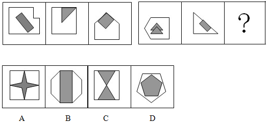 A.A B.B C.C D.D 答案:C。 解析:观察两组图形,每组图形的内部图形与外部图形相接的边数,依次是0、1、2。当然,只有这一个规律并不能直接选出答案,因此,还需寻找别的规律。从另一个角度考虑,第一组图形中,外部图形的边数依次是6、4、5;第二组图形中,外部图形的边数依次是5、3、(4)。两个角度结合,可以直接选出答案C。