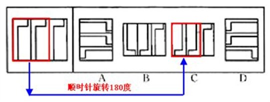 这道题属于位置类,主要考察图形的顺时针旋转。将C中左边部分由两个小图形组成的矩形旋转180度,即为提示框中的图形,因此C选项正确。">