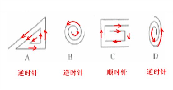这道题属于位置类,主要考察图形的顺时针旋转。只有C的螺旋方向为顺时针,其余三项都为逆时针,故选C。