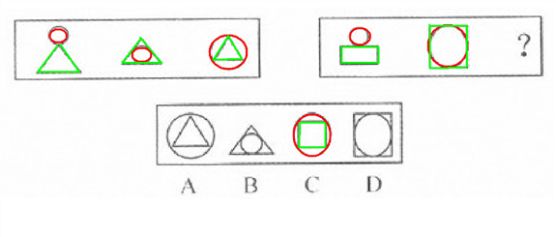 这道题属于位置类,主要考察图形嵌套元素间的相对位置。左边一组中,圆与三角形的位置关系分别为顶部相接、圆在三角形内部以及三角形在圆内部,据此规律,右边一组中,第三个图形应为圆在正方形外部,故正确答案为C