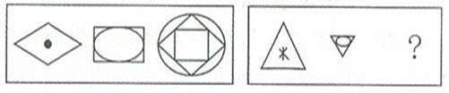 这道题属于结构类,主要考察图形的叠加:前面的图形叠加组成后面的图形。分析左边一组图形可知,图一内部元素隐藏,图一的外框为图三的中间层.图二的外框图形为图三的最里层,图二的内部图形为图三的最外层,据此规律,右边一组中,图一内部元素隐藏,图三的最外层为圆,中间层为直立三角形,最里层为倒三角形,故正确答案为A。