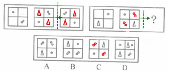 这道题属于位置类,主要考察图形的逆时针旋转。图形高度相似,可以从旋转、移动入手。左边一组中,图一中两组小白点同时逆时针移动一格,三角形从图二开始均出现在空白处。据此规律,右边一组中,一个小白点与一个三角形同时逆时针移动一格,两个小白点的图形从图二开始均出现在空白处,故正确答案为C。