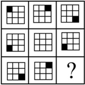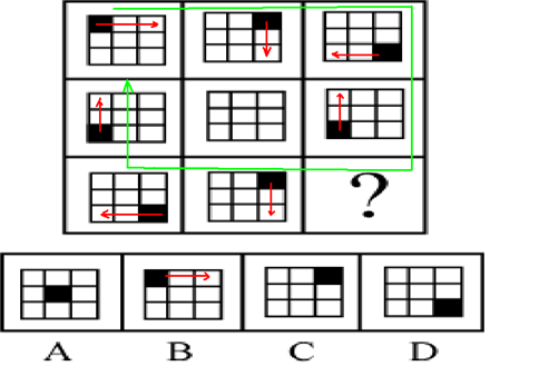 这道题属于样式类,主要考察对九宫格的观察角度:旋转。顺时针方向看,会发现黑色小方框在作顺时针旋转。