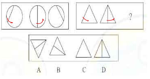答案:C。 解析:这道题属于位置类,主要考察图形中元素的逆时针旋转。左图圆中直线做逆时针转动,右图规律相同且图中斜线与三角形边重合,故选C(此解析由奥特胖提供)