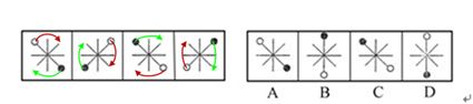 这道题位置类,主要考察图形的顺时针旋转。通过已知的四个图形不难看出实心圆圈顺时针旋转,故正确答案为A。