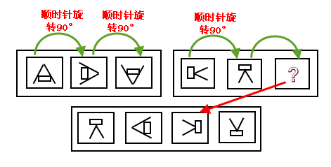 这道题属于位置类,主要考察图形的顺时针旋转。第一组图中,后一个图形都是前一个图形顺时针旋转90°得到的;且第二组图中,第二个图形是第一个图形顺时针旋转90°得到的,故按照这个规律选C。">