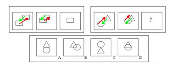 这道题属于位置类,主要考察图形的局部元素的平移。根据前一组图形的变化规律,可见图中两个图形逐渐向中心靠拢,最终重合。