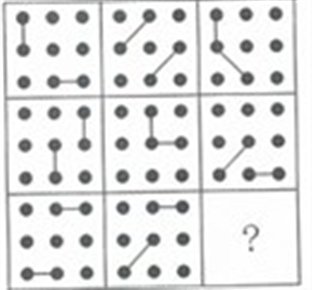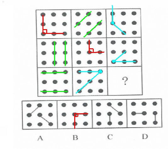 这道题属于位置类,主要考察对九宫格的观看角度:横看。各图形中构图元素都未变化,只是两个线段的位置关系发生变化,由此可推知,此题旨在考查两个线段的位置关系;九宫图的试题,其图形或以行为单位变化,或以列或其他顺序,故要找到此题的变化顺序。仔细观察可发现,此题的图形是以行为单位变化的,每行的火柴都有垂直、平行和相交(或延长之后相交),且每行中只有一个是有交互的图形,故答案为B。