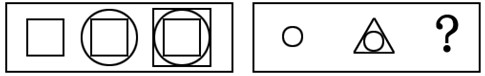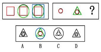 这道题属于结构类,主要考察图形的叠加,即前面的图形叠加组成后面的图形。第一组图形的第三个图形是把第二个图形放到第一个图形里面得到的,并且,两个部分是有交点的,依此规律,只有B是满足要求的。