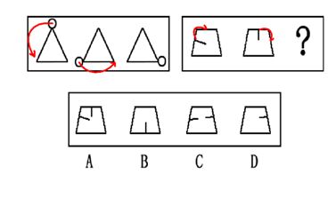 这道题属于位置类,主要考察图形中的局部元素的顺时针旋转。第一组图形中的主体部分三角形不变,小圆形依次逆时针旋转到每个顶点上;第二组图形中,主体部分等腰梯形不变,一条线段在梯形内部顺时针旋转到与梯形每边垂直相交的位置。