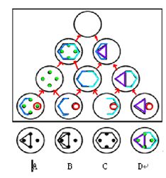 这道题属于结构类,主要考察图形的叠加,即前面的图形叠加组成后面的图形。从下往上,每两个图形叠加都得到上一个图形。选D。