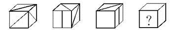 将图中上部最左边的一个正六面体进行旋转,第一次旋转后得到左第2图,再顺同一方向旋转,得到左第3图,那么再顺同一方向旋转,而后得到的左第4图应是( )。