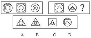 A.A B.B C.C D.D 答案:B。 解析:第一套图中每个图都由3个元素构成,且每个元素都在每个图形的外面,中间,里面各出现一次,依此规律可推知正确答案为B。">