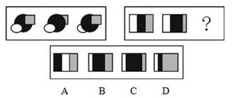 本题考查的是数量类中的面的面积。观察第一段图形发现3个图形的黑色阴影的面积各不相同,第二个最大,第三个次之,第一个最小,延续这一规律,“?”处的图形的黑色阴影面积应该比第二个小,排除C选项,比第一个大,排除A和D,只有B符合。因此,本题答案为B选项。