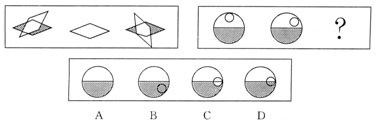 A.A B.B C.C D.D 答案:C。 解析:第一组图形中,无阴影的平行四边形在有阴影的平行四边形上方顺时针旋转,每次旋转的角度约为45度,而且两者重合的部分无阴影。同理,第二组图形中的小圆圈顺时针旋转,并且重合的部分无阴影。因此,本题答案为C选项。">
