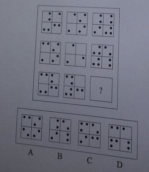 本题答案应该选择D选项,理由有二:第一是对角线同位置求同得到中间的图形,第二是横行点数之和均为偶数。