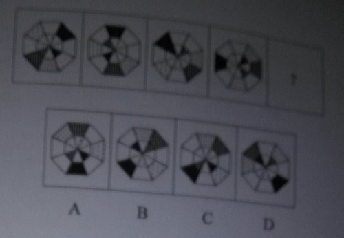此题考的是位置平移的规律,全黑的梯形逆时针平移1格,据此可以排除A和D两个选项。全黑的三角形顺时针平移2格可以确定C选项为正确选项。