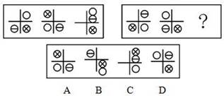 A.图A B.图B C.图C D.图D 答案:C。 解析:本题考查图形推理的位置变化。第一组图中以第一幅图形为原图形,则原图形中三个元素位置移动得到第二个图形,第二个图形中的元素保持前面的移动规律继续移动得到第三个图形,移动规律为:空白圆每次顺时针走两步、带乘号的小圆每次顺时针走两步,带减号小圆每次逆时针走一步。依此元素变化规律观察第二组图形发现,移动规律为:带减号小圆每次顺时针走两步、空白圆每次顺时针走两步、带乘号的小圆每次逆时针走一步