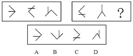 此题的解题思路为图形的形状和位置。第一组图中的图形特征为三个图形全部包含相同的角,且角的开口方向分别为向左、向右、向下,且有与之相交的线,线分别在角的里面、外面、与角的一边出头相交。依此规律推之第二组图中所缺图形为A。
