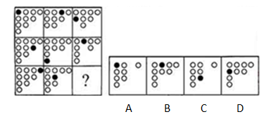 A.A B.B C.C D.D 答案:C。 解析:每一行三个图形的元素个数分别为10、9、8,则问号处元素个数为8,排除选项B、D。每个图形中的黑圆圈所处位置,都与前一个图形中的黑圆圈在此图形中的位置相隔一个空心圆圈。故选C。">