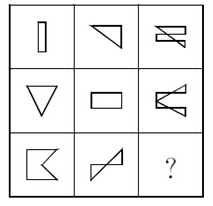 每一行三个图形,第一个图顺时针旋转90°后与第二个图形叠加,去掉相同的部分,即得到第三个图形。故选D。
