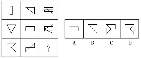 A.A B.B C.C D.D 答案:D。 解析:每一行三个图形,第一个图顺时针旋转90°后与第二个图形叠加,去掉相同的部分,即得到第三个图形。故选D。">