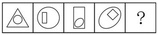 每幅图中都由里外连个图形构成,且前一幅图里面的图形都是下一幅图外面的图形,由此排除A、B选项。因为每一幅图中的两个图形都是由一个曲线图形和一个直线图形构成的,所以排除C选项。所以选D选项。