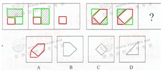 本题属于样式类,主要考察了图形样式变化:去异存同。,第一组图形中,前两个图形白色区域求同得到第三个图形,依照此规律,所以选择A选项。